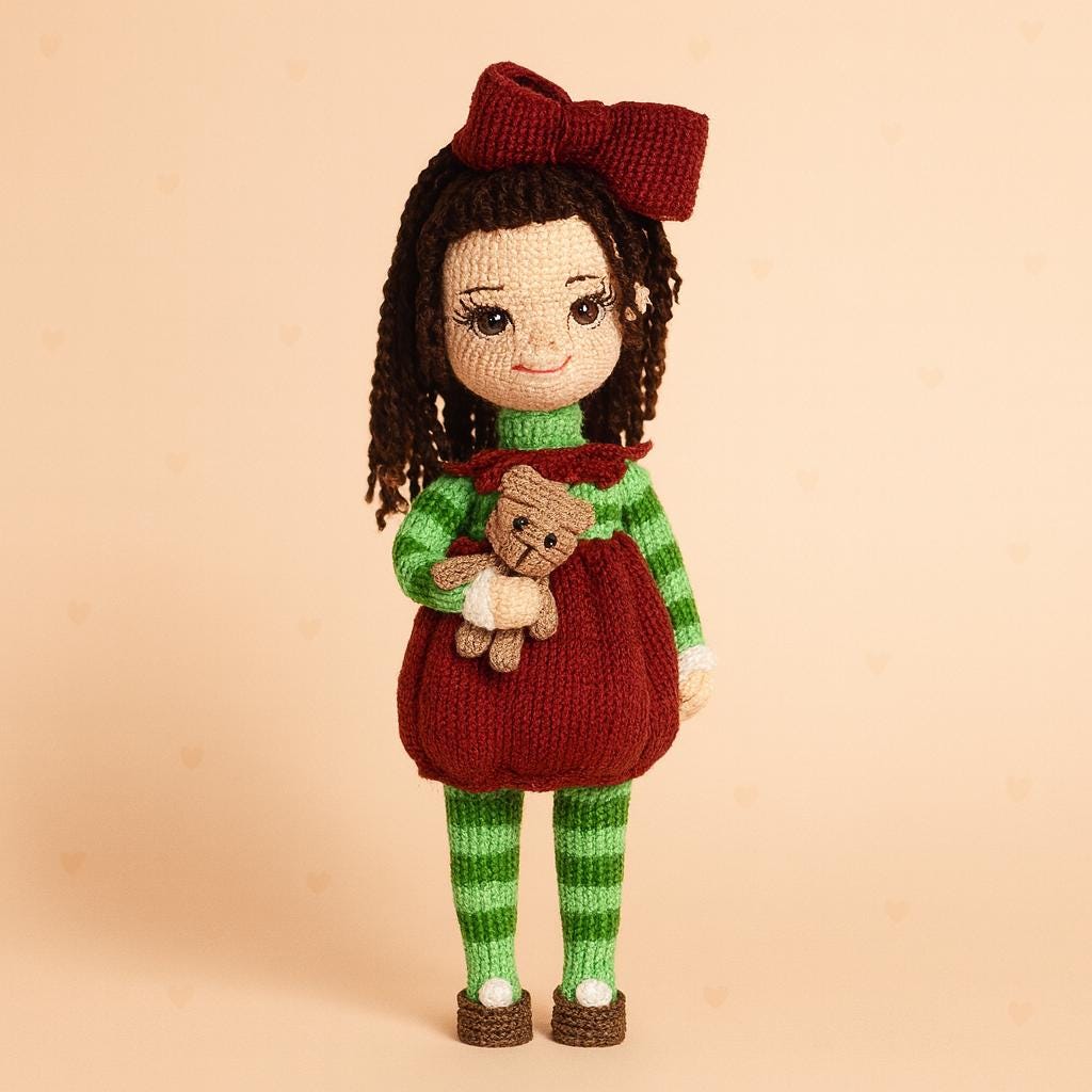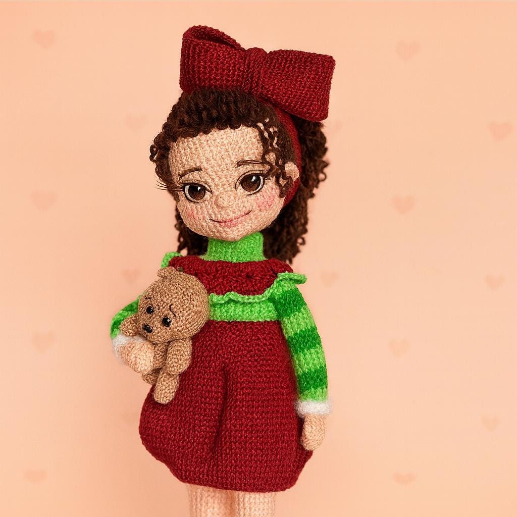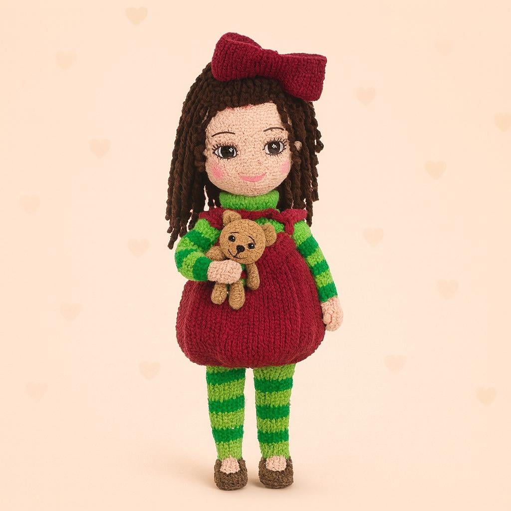 This pattern teaches you how to make a fully poseable doll with a wire frame, a lush ponytail hairstyle, a removable or non-removable skirt, bib, bow headband, beautiful shoes, and a tiny crocheted teddy bear.